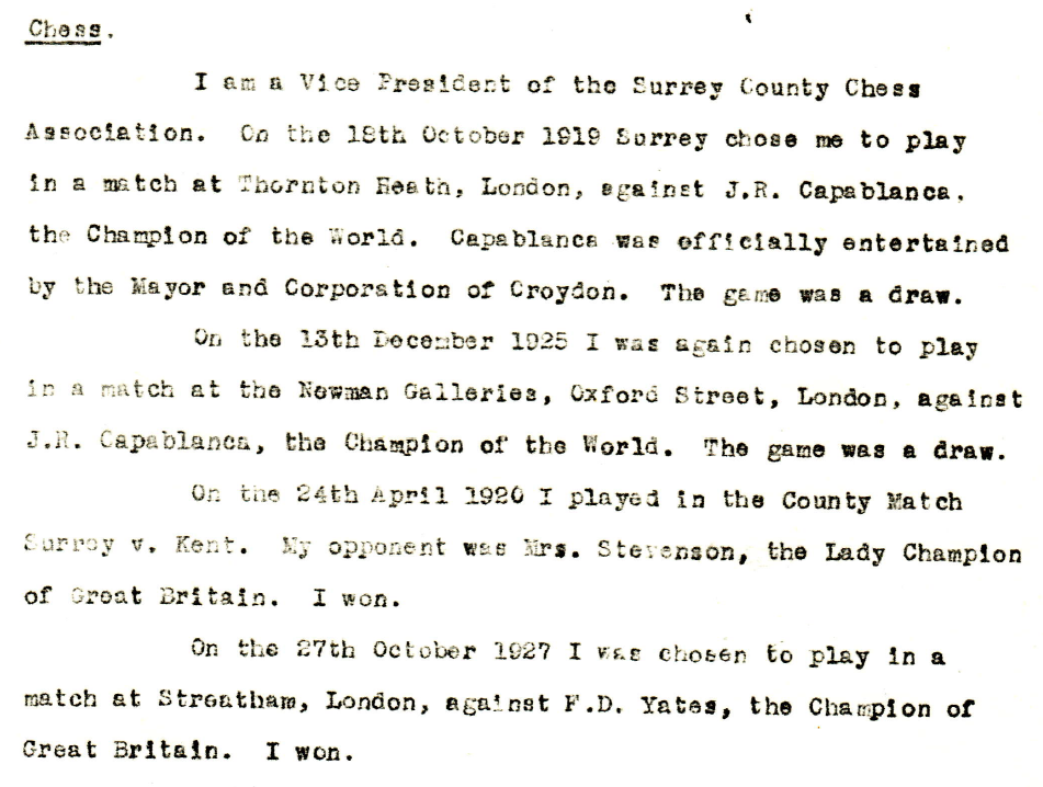 As mentioned above, there is the one explicit reference in his Reminiscences to a County match: his victory over Mrs Stephenson "the Lady Champion of Great Britain" on 24 April 1920 in a Surrey v Kent encounter (it should not detract from his achievement to point out that she only became Champion in August that year, at the Edinburgh BCF Congress). However, per information from Martin Cath, the Match Books actually show an engagement between Surrey and the Croydon League on that date, so he may have misremembered the detail. Carus doesn't mention that he played Mrs S again, in 1931, on board 24 of what was then, without doubt, a Surrey v Kent match. They drew their game on this subsequent occasion.
